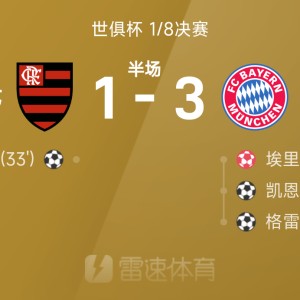 06月30日讯 25赛季世俱杯1/8决赛,弗拉门戈迎战拜仁慕尼黑。半场战罢,双方比分暂为弗拉门戈1-3拜仁慕尼黑,埃里克...
