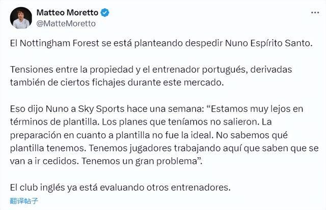 2025-26赛季英超开幕仅一周,就有球队计划换帅。8月22日,知名记者Matteo Moretto透露,诺丁汉森林老板马里纳基斯,与主帅努诺产生矛盾。努诺公开抱怨球队夏窗引援不力,球队远远没有准备好。诺丁汉森林已经做好与努诺分道扬镳的准备,开始物色新帅人选。