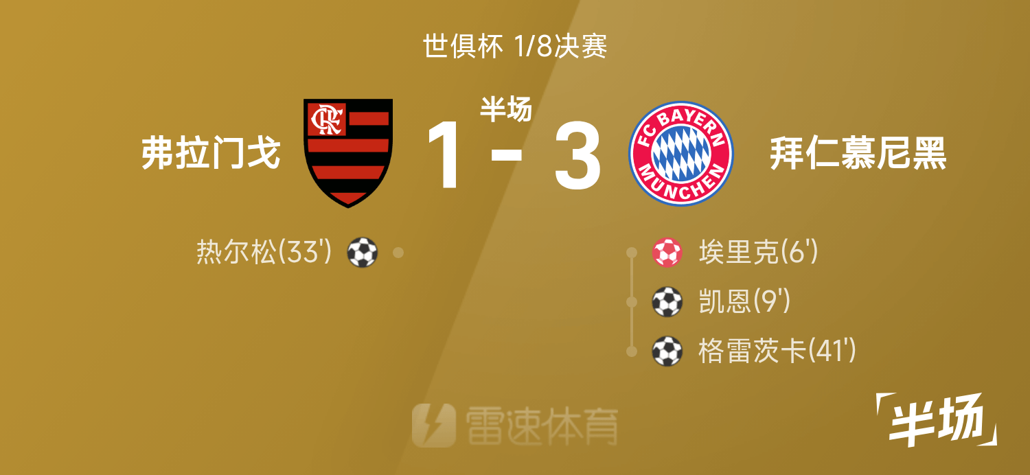 06月30日讯 25赛季世俱杯1/8决赛,弗拉门戈迎战拜仁慕尼黑。半场战罢,双方比分暂为弗拉门戈1-3拜仁慕尼黑,埃里克自摆乌龙,凯恩、格雷茨卡破门建功,热尔松世界波帮助弗拉门戈扳回一城。